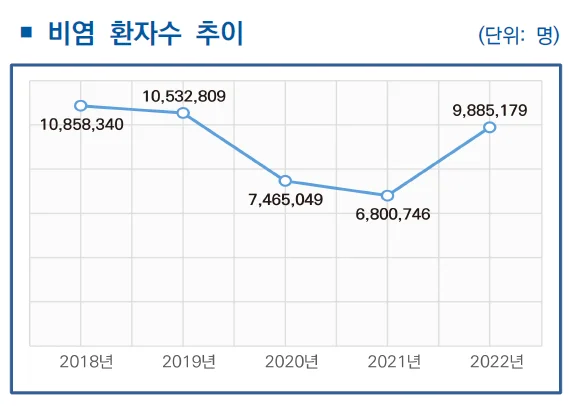 건강보험심사평가원 자료에 따르면 2022년 기준 우리나라의 비염 환자의 수는 1,000만명에 가깝다고 합니다.