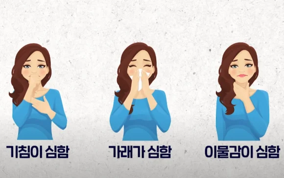이 끈적한 콧물이 목으로 넘어가면서 이물감이 생기고 자꾸 들러붙게 되는 것이지요.