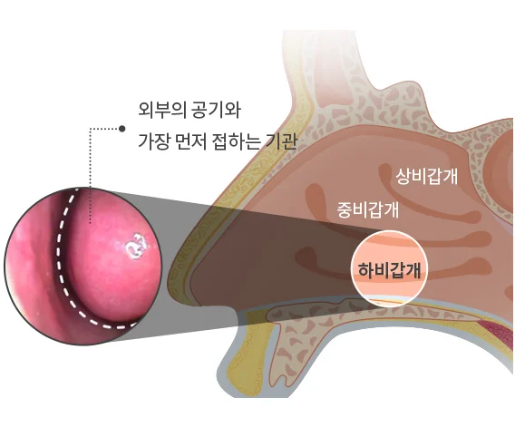후비루 가래 증상의 근본적인 해결을 위해서는 코 속 하비갑개가 정상적으로 작동하도록 만드는 것이 중요합니다.