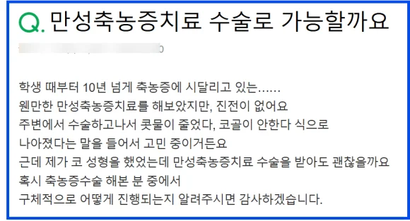 만성 축농증을 겪는 분들이 가장 많이 하는 고민입니다.